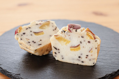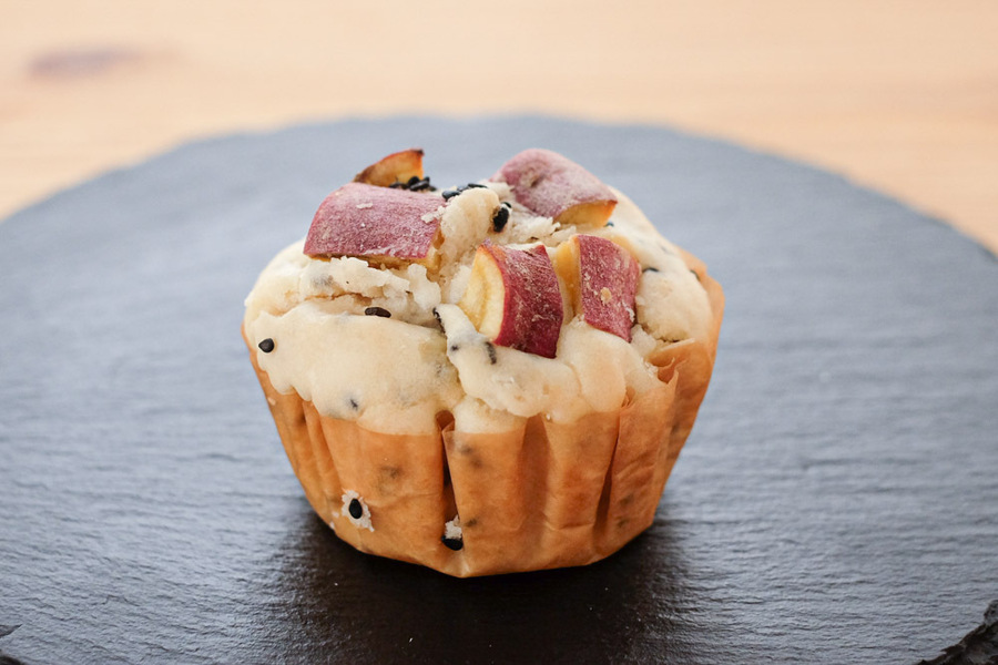 鳴門金時と黒ごまを練り込み焼き上げました。しっとりとした優しい味わいです。 季節によってトッピングする具材を変えています。