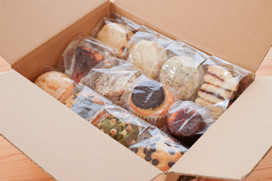 10~12個の焼き菓子が入ります。 スコーンとマフィンが主に入ります。 ※バスクチーズケーキやカヌレなどの焼き菓子が入ることもあります ※商品の種類はお選びいただけません ※お試し購入いただきやすいよう、箱いっぱいの内容量ではございません。予めご了承ください。