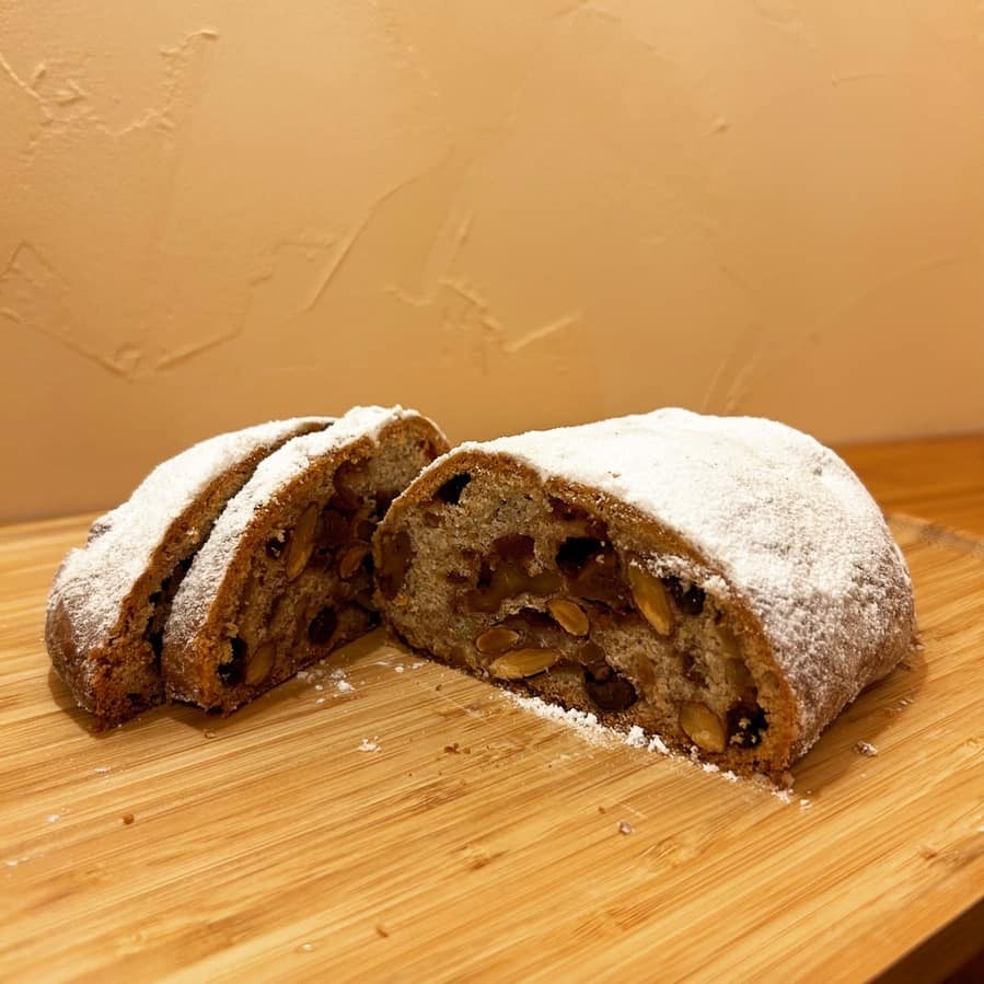 シュトレン:北海道産小麦粉、無塩バター、自家培養発酵種(道産小麦粉、道産米、米麹)、有機ココナッツミルク、洋酒、有機いちじく、有機レーズン、有機クランベリー、柚子ピール(無農薬柚子、きび糖)、くるみ、アーモンド、北海道産自然栽培ライ麦粉、有機ライ麦粉、きび糖、粉糖、アーモンドプードル、塩、有機シナモンパウダー、ナツメグ、カルダモンパウダー、バニラビーンズ アレルゲン(7品目):小麦、乳成分、くるみ ※アレルギーが心配な方はご遠慮ください。
