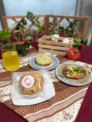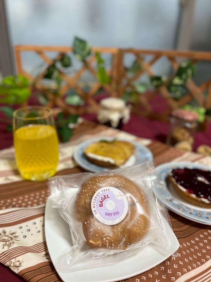 2本の米粉パンが入ります。 1本、約230gで八枚切りです。 冷凍ですが、必要な分を取り出せてそのまま焼けます。 100gのベーグルです。ドライイチジク入りとトマトガーリック、オリーブの塩コショウで味付けしたイタリアン味です。