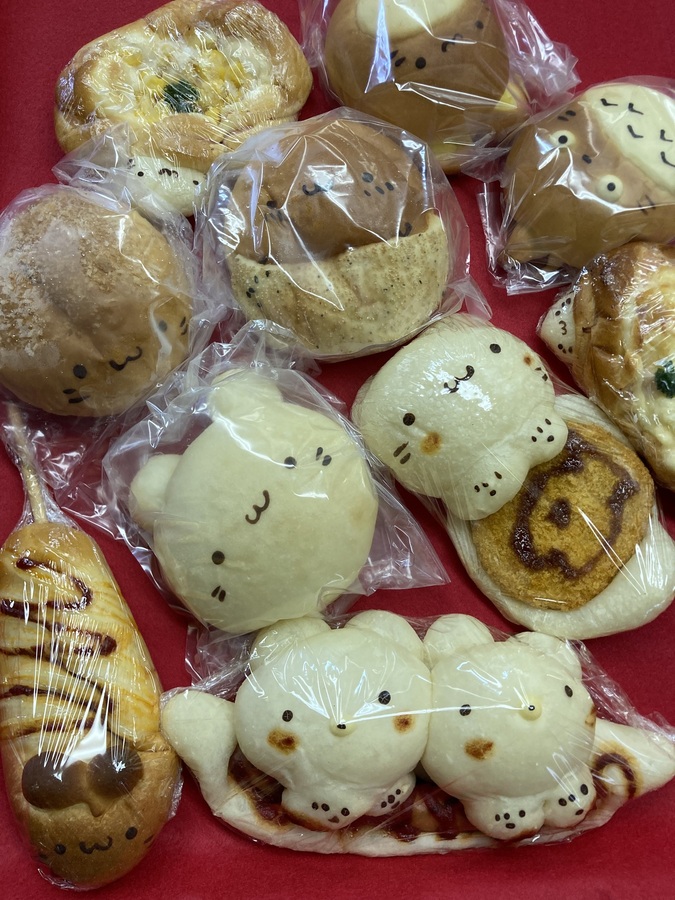 くまウィナー。にゃんころっけ。ミルククリーム。ハムチーズ。ハムコーン。チョコクリームパン。クリームパン。カレーパン2個。フランクフルト2個。栗あんぱん等、顔付きパンが12個入ります。
