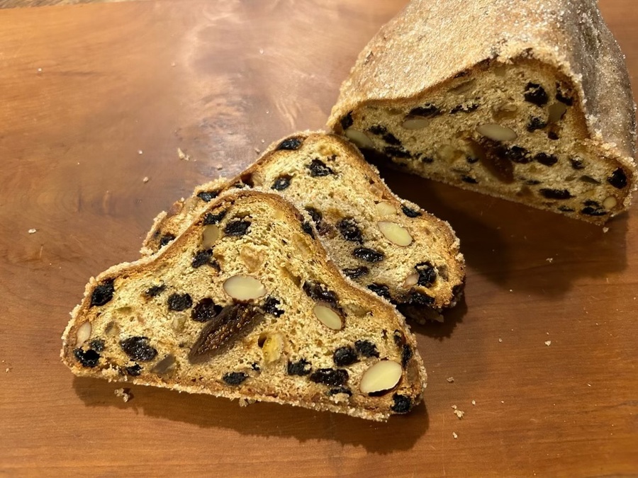 北海道産小麦、有機全粒粉、ルヴァン種、とかち野酵母、発酵バター、無塩バター、ゲランドの塩、有機レーズン、有機カレンズ、有機いちじく、有機オレンジピール、有機クランベリー、 有機グラニュー糖、きび砂糖、だて牛乳、くるみ、アーモンド、カルダモン、クローブ、ナツメグ、シナモン、ラム酒