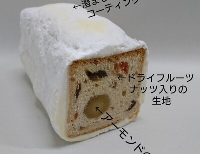 小麦粉(国内製造)、バター、オレンジ、レーズン、アップル、チェリー、パイン、いちじく、クルミ、アーモンド、ラム酒、卵、牛乳、砂糖、パン酵母、塩、(原材料の一部に小麦・卵・乳成分・クルミ・りんご・オレンジ・アーモンドを含む)