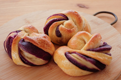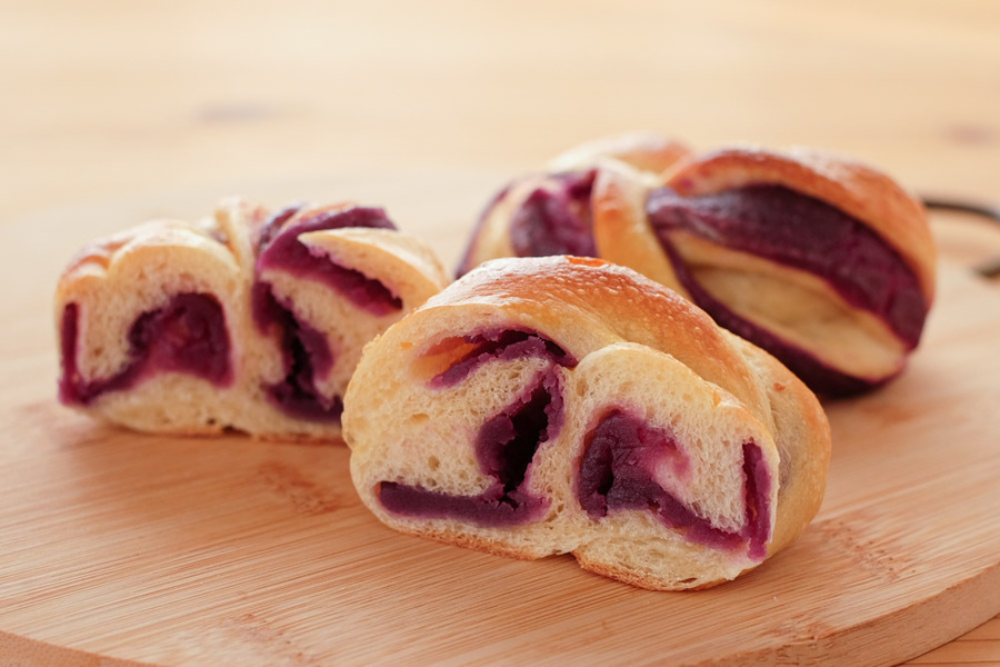 主な原材料:小麦粉、全粒粉、バター、てんさい糖、パン酵母、塩、牛乳、卵 他 アレルゲン(8品目):小麦・卵・乳成分・くるみ 紫いもあんぱん(商品一例):紫いもあん(紫いも、砂糖、いんげん豆、寒天)、小麦粉、牛乳、バター、卵、てんさい糖、パン酵母、塩 ※アレルギーがご心配な方はご遠慮下さい。 ※各パンに原材料表示シールを貼付します。