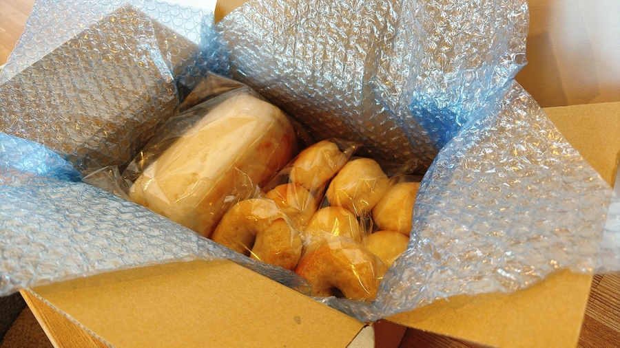 自然解凍後、あらかじめ予熱しておいたオーブンやトースターで温めてお召し上がりください。(※気温が上がってくる夏場は一晩冷蔵庫で解凍してください) パン全体に霧吹きなどで軽く水をかけてからトースターで3分~4分ほど加熱するとさっくり、もっちり出来たてのようになり美味しく召し上がれます。