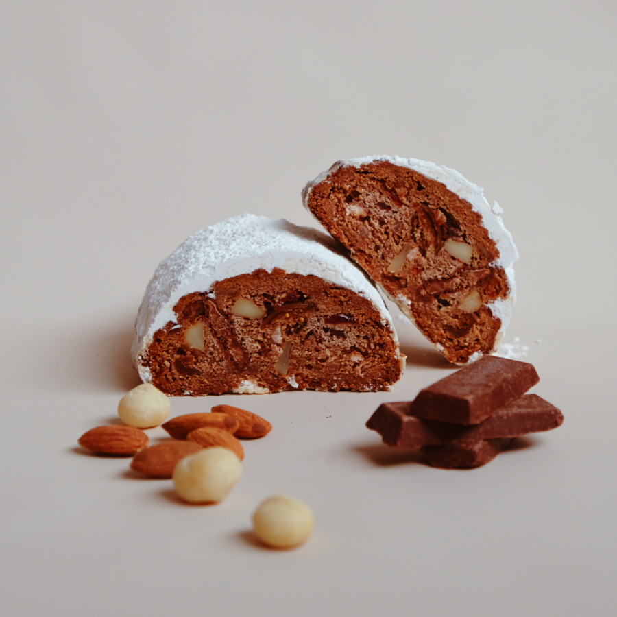 小麦粉、グラニュー糖、バター、粉糖、カカオマス、砂糖、ココアバター、ココアパウダー、いちじく、クランベリー、レモン、レーズン、アーモンド、マカダミアナッツ、イースト、ラム酒、ブランデー、塩、香辛料/乳化剤 アレルゲン8品目:小麦・乳