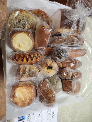 何度かリピートして注文しています。バラエティに富んだパン(や時にお菓子)がたくさん入っていました。お食事系のパンも甘いパンもどれを食べてもとても美味しいです。ありがとうございました!