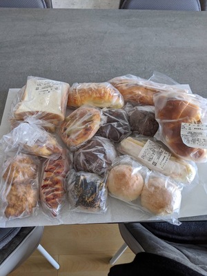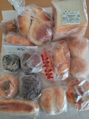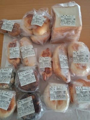 たくさんの美味しそうなパンが届きました。ひとつひとつ品名が貼ってあるので分かりやすくいろいろな種類がはいっているのでとても楽しみです。