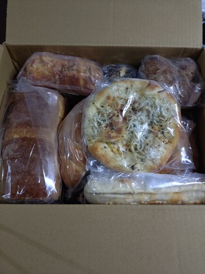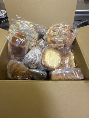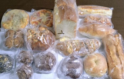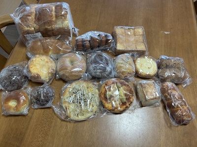 たくさんの美味しそうなパンが届きました。ひとつひとつ品名が貼ってあるので分かりやすくいろいろな種類がはいっているのでとても楽しみです。