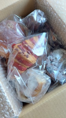 昨日受け取りました。箱いっぱいにありがとうございました。今朝、チョコと胡桃のクロッカンをいただきました。カリッとして甘さも程よく美味しかったです。自家製あんバターや自家製大納言あんぱんも食べるのが楽しみです♪