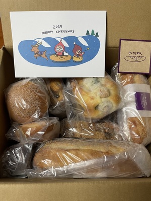 パンとクリスマスカードに温かいメッセージ届きました!いつも配慮ありがとうございます。食べてみたかったエッグタルトが入っていて、とっても美味しかったです。前回ガーリックフランスがとても印象に残っていたので、入っていて嬉しいです♪バケットが美味しいので明太フランスも美味しかったです。食パンも後味がいいなとあらためて思いました。キャロットケーキがオプションで購入できるようになったので、ぜひまたリピートしたいです。