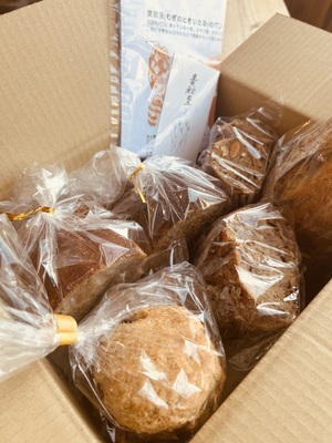 2870円以上のパンが7~8個(ハーフサイズ)ほど入ります。 ※パンの大きさにより前後します。 全粒粉のパンを中心にライ麦パンやカンパーニュ、バゲットなどの食事パンや全粒粉スコーン、あんバターが入ることもあります。
