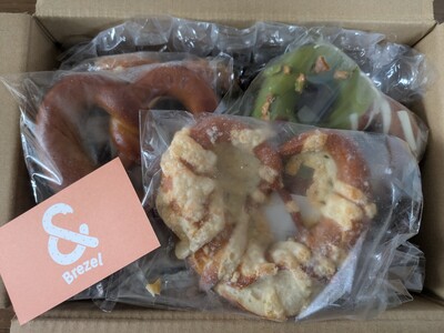 たくさんの美味しそうでボリューム満点のブレッツェルの宝箱が届きました!!食べるのが楽しみです!ありがとうございます!!