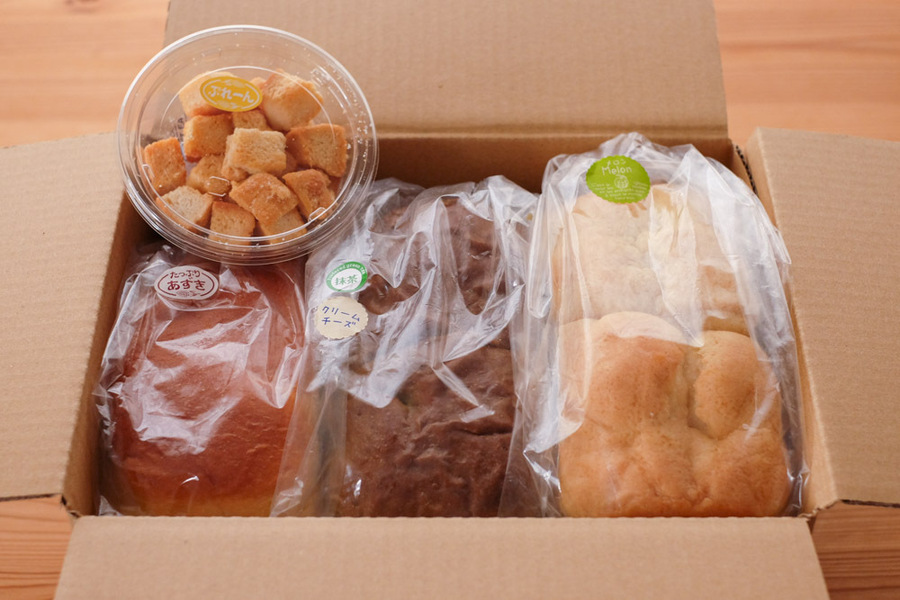 ・ワンローフ型食パン 3本(おおよその大きさ 約 縦17㎝ × 横8㎝ × 高さ7~8㎝) ・お楽しみ(ラスク1箱 または 小物パン1~2個 または スライス食パン数枚) ※ワンローフ型の食パンはブロックのままのお送りとなります。