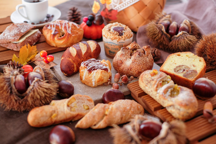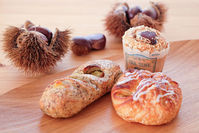 ベッカライ徳多朗 ・栗のパウンドケーキ(グラニュー糖、バター、小麦粉、卵、栗加工品、バニラビーンズ / 膨張剤) ・栗とチョコ(小麦粉、栗加工品、クルミ、チョコレート、小麦全粒粉、ポピーシード、塩、モルトエキス、酵母 / アセロラ粉末、クロレラエキス粉末、乳化剤、米こうじ、香料) PUBLIC ・マロンパイ(渋皮栗甘露煮、小麦粉、バター、栗ペースト、アーモンドプードル、卵、グラニュー糖、ラム酒、塩) ・マロンあんバター(小麦粉、栗あん、クルミ、バター、ココアバター、塩、モルト、酵母) 渡りに麦 ・栗のヴァイツェンミッシュブロート(小麦粉、ライ麦粉、甘栗、さつまいも、米油、塩、酵母) ・栗のプレッツェル(中力粉、薄力粉、無塩バター、栗ペースト、クリームチーズ、グラニュー糖、塩、酵母) 3 Bake ・和栗あんと紅茶(小麦粉、あん、砂糖、フラワーペースト、栗ペースト、渋皮付栗、紅茶、塩、モルト、酵母 / 甘味料、トレハロース、増粘剤、香料、乳化剤) ・マロンパイ風デニッシュ(小麦粉、砂糖、バター、牛乳、脱脂粉乳、塩、あん、フラワーペースト、栗ペースト、渋皮付栗、モルト、酵母 / 甘味料、トレハロース、増粘剤、香料、乳化剤) ・マフィン(小麦粉、砂糖、卵、植物油、あん、フラワーペースト、栗ペースト、渋皮付栗、ショートニング、ココナッツ、脱脂粉乳、塩、モルト、酵母 / 甘味料、トレハロース、増粘剤、膨張剤、香料、乳化剤、グリシン、着色料、ポリリン酸Na、酵素) ※一部に小麦・卵・乳成分・クルミを含む