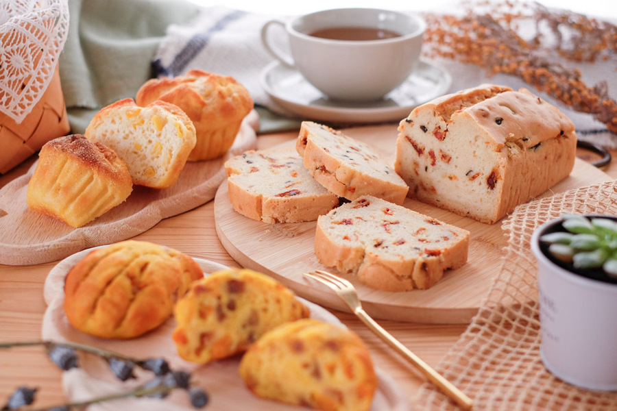 🍅ブラックオリーブとドライトマトの米粉ケーキ:米粉(国産)、豆乳、菜種油、アーモンドプードル、きび砂糖、ブラックオリーブ、ドライトマト、オリーブオイル、にんにく、塩、こしょう、ブラックペッパー/ベーキングパウダー 🌽米粉のコーンパン 岩塩添え:米粉(国産)、とうもろこし、コーングリッツ、てんさい糖、バター、岩塩、オオバコ、ドライイースト、塩 🌰栗かぼちゃといちじくの米粉カンパーニュ:米粉(国産)、かぼちゃ、ドライいちじく、くるみ、メープルシロップ、オオバコ、食塩、ドライイースト