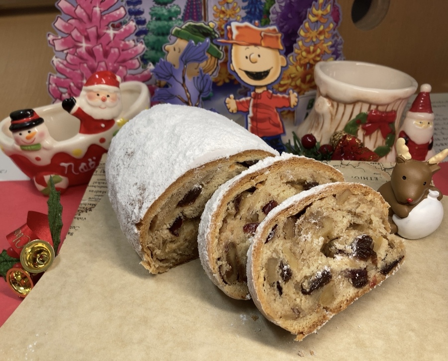 主な原材料:洋酒漬け果実(レーズン、クランベリー、いちじく、アプリコット)、小麦粉、バター、牛乳、くるみ、アーモンド、砂糖、卵、塩、パン酵母、ラム酒、シナモンパウダー、オールスパイス アレルゲン(8品目):小麦・卵・乳成分・くるみ