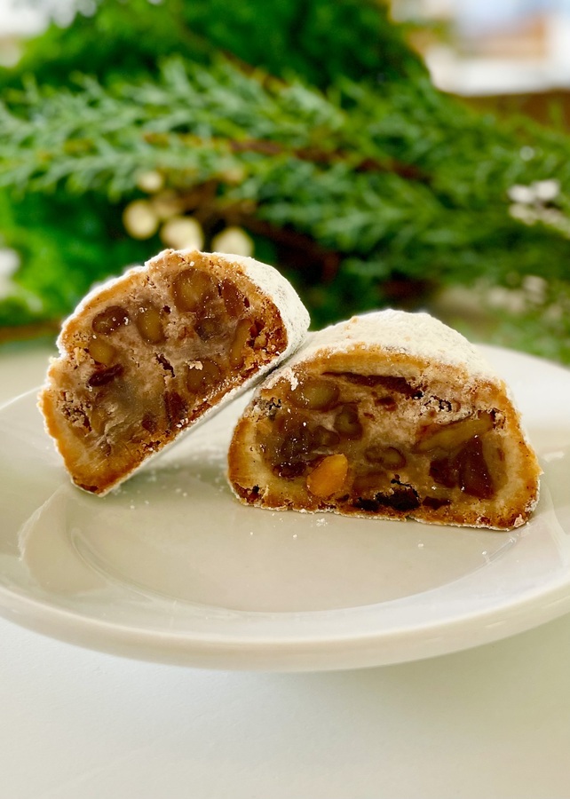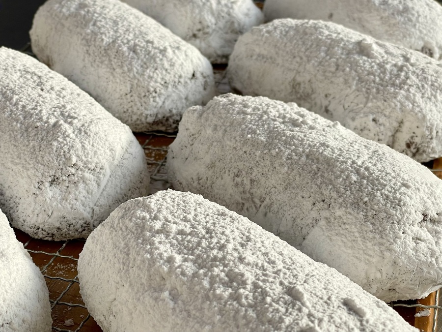 1. 真ん中から切る まずはシュトーレンの中央から包丁を入れ、 必要な分だけスライスします。 → 端からではなく“真ん中から”切ることで、 両端を合わせて再び密着させられ、 切り口の乾燥を防ぐことができます。 2. 薄くスライスして味わう 5〜10mmほどの厚さにスライスして、 そのまま、または少し常温に戻してからお召し上がりください。 時間が経つほど洋酒とバターがなじみ、 しっとりと深みのある味わいに変化します。 3. 食べ終わったら“切れ目を合わせて”包む 食べた後は、左右の切れ端をくっつけるように合わせて、 ラップでしっかり包みます。 さらにアルミホイルや保存袋に入れておくと、 乾燥を防ぎ、最後までしっとりおいしく保てます。 4. 少しずつ味の変化を楽しむ シュトーレンは、焼きたてよりも数日後からが食べ頃。 時間の経過とともに、洋酒の香りやフルーツの甘みが調和していきます。 1日目、1週間後、2週間後… 少しずつ切り分けながら、熟成の変化を味わってみてください。