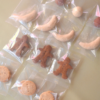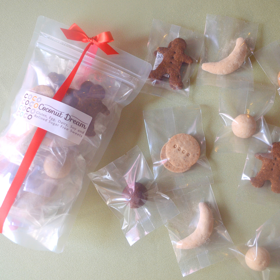 ●ココビスケット 2枚入り x3袋 ●ジンジャーマンビスケット 2枚入り x3袋 ●バニラクレッセント 1個入り x4袋 ●ココボール 1個入り x4袋 (ココナッツx2、カカオx2)