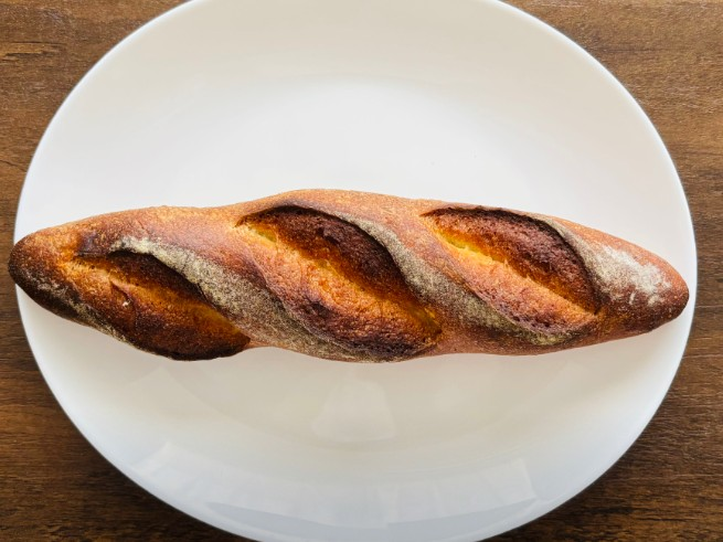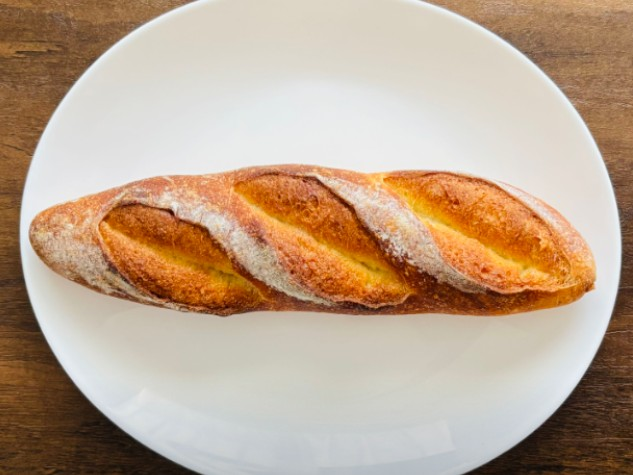 【1/3バゲット】 180℃で予熱したオーブンで5分(冷凍ままなら10分)が目安です。 手で折ってクラスト(表面)がバキッと良い音がしたら食べ頃ですが、柔らかいクラム(内部)を主に楽しむSOFT仕様は温める程度で音がしなくても大丈夫です。 小さく手でちぎって20回ほど噛むと本来のパンの味が楽しめます。お好みでバター、チーズ、ハムなどとあわせてお楽しみください。15mmほどにスライスしてアヒージョやブルスケッタに、サイドカットして具を挟んでカスクートにするのもお勧めです。