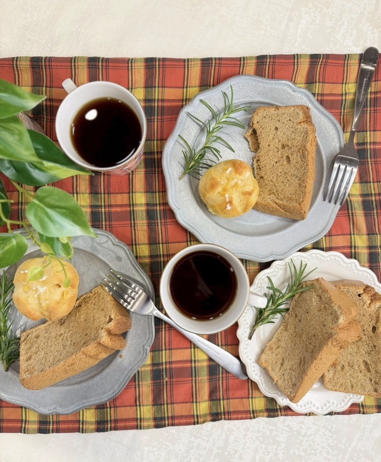 🌽米粉のコーンパン岩塩添え:米粉(国産)・とうもろこし・コーングリッツ・砂糖・バター・岩塩・オオバコ・ドライイースト・塩 ☕️米粉の薬膳チャイシフォン:卵白・米粉(国産)・きび砂糖・牛乳・卵黄・米油・国際有機黒糖・有機ジンジャー・有機シナモン・有機紅茶(アッサム)・有機カルダモン・有機クローブ・有機ピンクペッパー