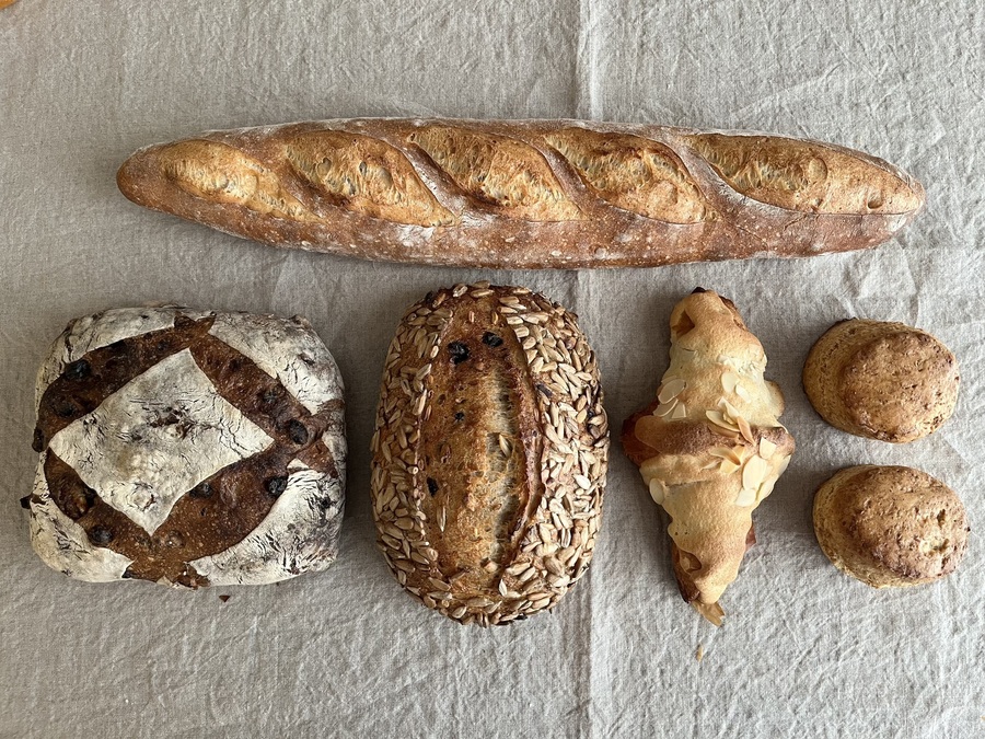 主な原材料:小麦粉、ライ麦粉、国産バター、有機ショートニング、きび砂糖、洗双糖、ゲランドの塩、自家培養ライ麦酵母、自家培養ルヴァン種、北海道産とかち野酵母、生イースト、有機ドライフルーツ、他 小麦は北海道産、ライ麦は北海道産有機ライ麦を 使用。 全粒粉は十勝オーガニックファームつちの実、阿部自然農園の小麦を自家製粉しています。 アレルゲン(8品目):小麦、乳、卵、ナッツ、ごま、くるみ くるみとクランベリーのパン(商品一例):小麦粉、全粒粉、クランベリー、くるみ、牛乳、砂糖、無塩バター、スキムミルク、塩、酵母 ※各パンに原材料表示シールを貼付します。 ※アレルギーが心配な方はご遠慮下さい。