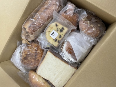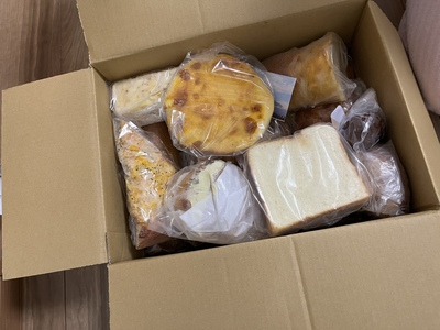 大きな箱にぎっしりのパン!初めてだったので、とってもびっくりしました(^^)自分では選ばないパンが入っていたり、食べた事ないパンは世界が広がって楽しいです!美味しいパンをありがとうございました♪