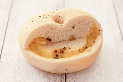 自然解凍後、霧吹きなどでベーグルを軽く湿らせます。 湿らせたベーグルをラップで包み、レンジ(600w)で20秒ほど温めます。 トースターで2分ほど焼きますと外はカリカリ、中はもっちり、ベーグルの出来上がりです!