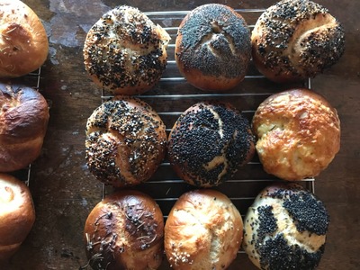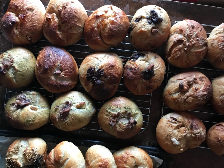 9個のベーグルが入ります。 種類はその日の状況で変わります、甘くないプレーンタイプのベーグル何種かと甘めのベーグルの混合です。最低8種類は入ります。