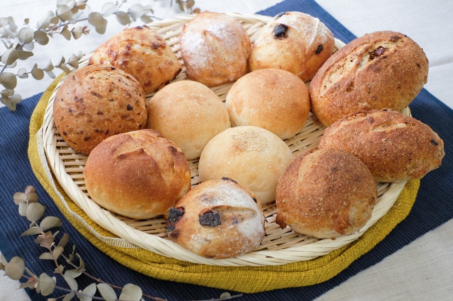 フランスパン生地のパンが9個 ●小さいオレンジパン ●いちじくパン ●小さいぶどうパン ●小さいくるみパン ●チョコレートパン 2個 ●ホワイトチョコパン ●りんごパン ●オニオンパン 国産小麦を使ったパンが3個 ●白いまるパン 2個 ●つぶあんぱん 合計12個入りのパンが入ります。
