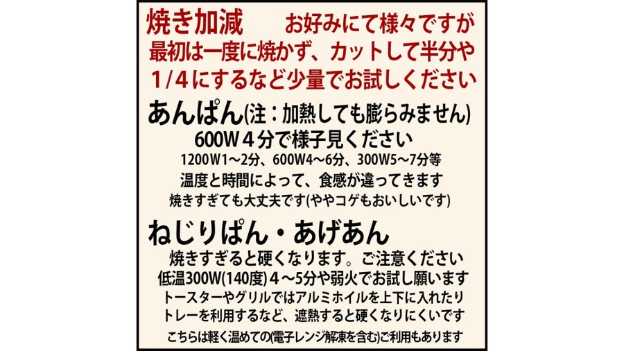 焼きすぎると硬くなりますので、低温300W(140度)4~5分や弱火でお試し願います。 トースターやグリルではアルミホイルを上下に入れたり、トレーを利用するなど、遮熱すると硬くなりにくいです。 こちらは軽く温めての(電子レンジ解凍を含む)ご利用もあります。 きなこパンも可能です。表面に軽く油が残るように加熱ください。