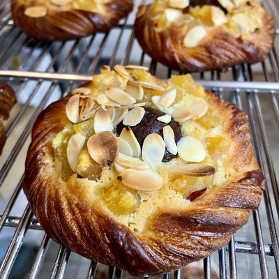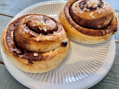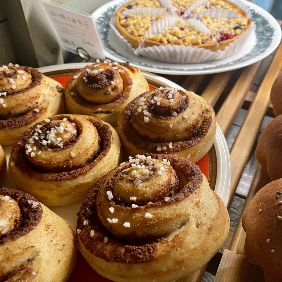 ●主な原材料 小麦粉、バター、塩、砂糖、酵母(自家製酵母含む)など。 シナモンロール(商品一例) 小麦粉、ライ麦粉、牛乳、バター、ブラウンシュガー、レーズン、アーモンドプードル、砂糖、シナモン、カルダモン、グローブ、塩、酵母 ※パンの種類により異なります。詳細はそれぞれのパンの包装に原材料表示シールを貼付します。 ※アレルギーがご心配な方はご遠慮ください