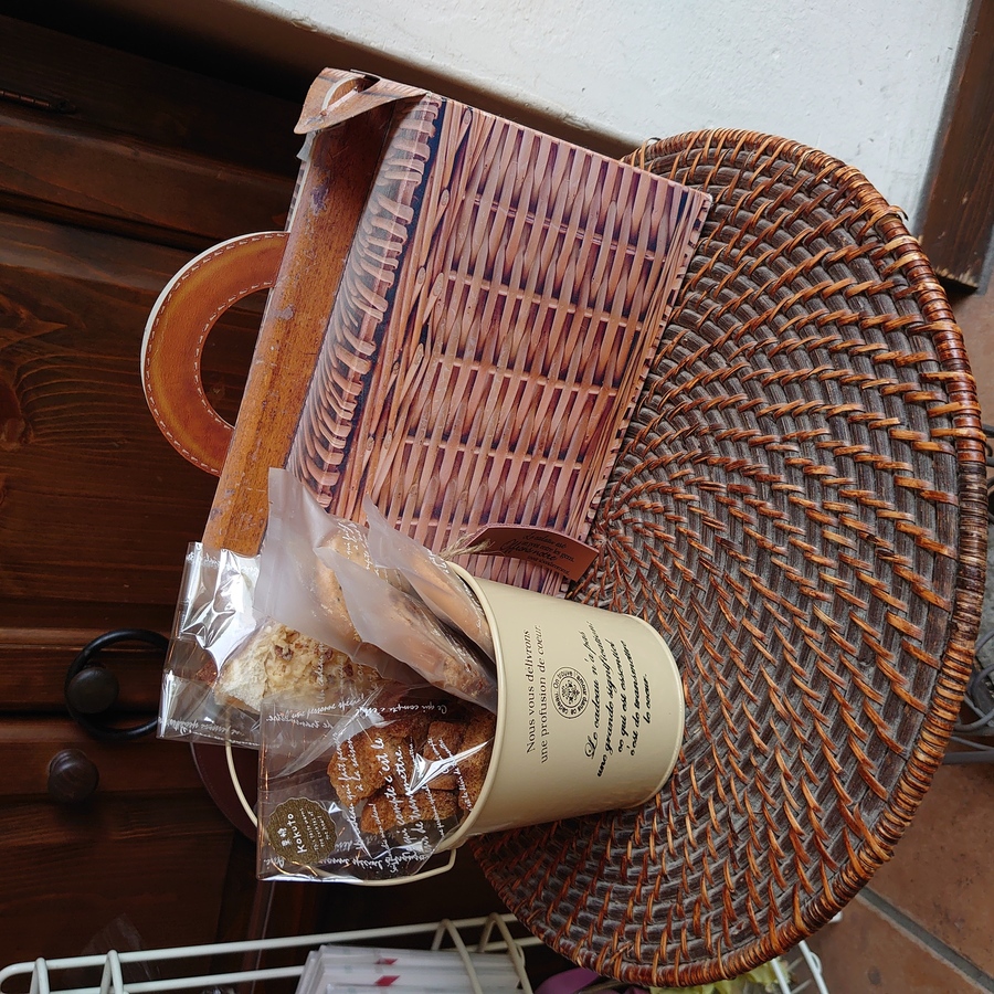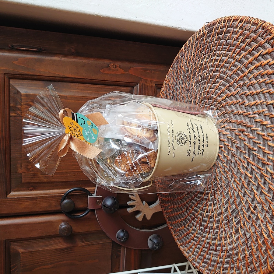 以下2つのギフトがセットになっています。 【リユースできるブリキ缶のバケツケースのギフト】 ●アーモンドラスク ●黒糖ラスク ●クッキー3種類(プレーン、セサミ、ショコラマーブル) 【藤籠柄のフェイクペーパーboxのギフト】 ●プルマン1斤 ●菓子パン2個(つぶあんパン、こしあんパン) ●焼きカレーパン
