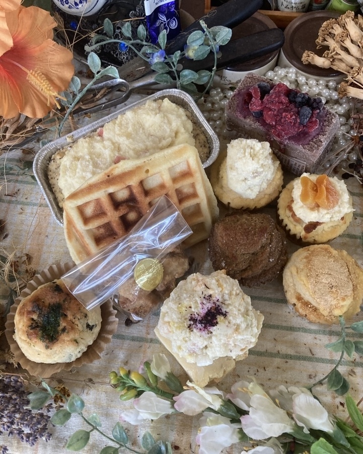 内容量: グルテンフリーの焼き菓子10種類が入ります。 「おからとお水のパウンドケーキ」x1本 「まごわやさしいパウンドケーキ(ベジパウンドケーキ)」x1個 「おからマフィン」x4個 「米粉と豆乳のスコーン」x1個 「豆乳と米粉のワッフル」x1枚 「おからと米粉のグラノーラ」x1包 「ココアの洋菓子」x1個 の合計10種類の組み合わせです! 【自家製ハーブのブレンドティー】 紅茶(インド産)、ミント、マリーゴールド、ガウラ、矢車草 もしくは ルイボスティー、ローズマリー、マリーゴールド、ガウラ、矢車草