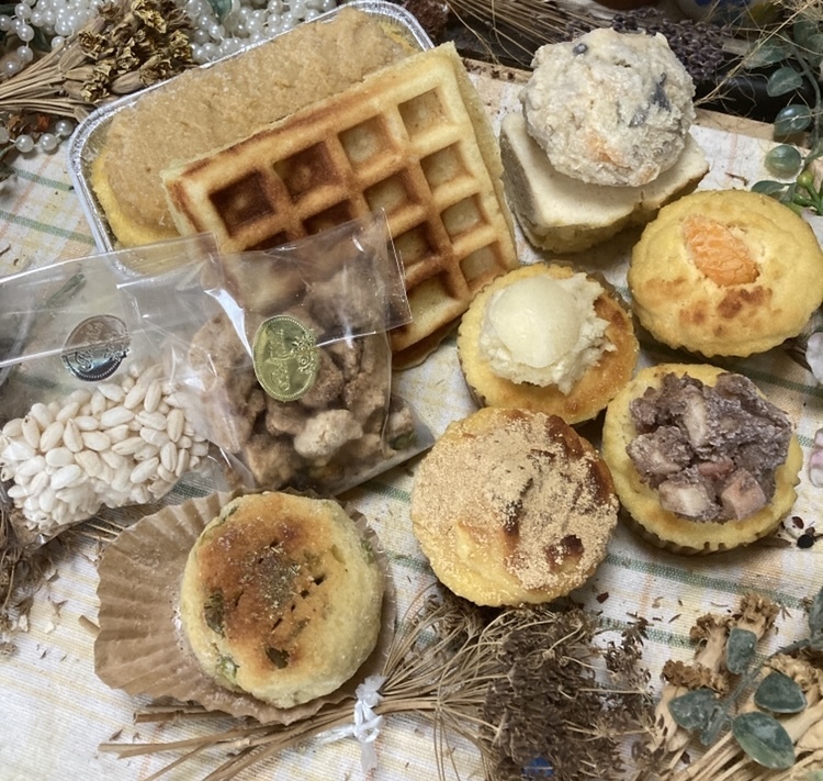 内容量: グルテンフリーの焼き菓子10種類が入ります。 「おからとお水のパウンドケーキ」x1本 「まごわやさしいパウンドケーキ(ベジパウンドケーキ)」x1個 「おからマフィン」x4個 「米粉と豆乳のスコーン」x1個 「豆乳と米粉のワッフル」x1枚 「おからと米粉のグラノーラ」x1包 「ココアの洋菓子」x1個 の合計10種類の組み合わせです! 【自家製ハーブのブレンドティー】 紅茶(インド産)、ミント、マリーゴールド、ガウラ、矢車草 もしくは ルイボスティー、ローズマリー、マリーゴールド、ガウラ、矢車草
