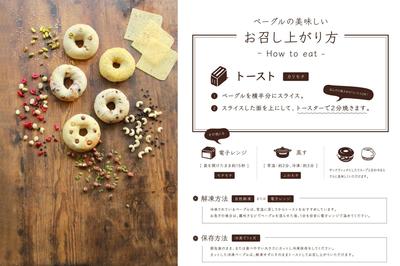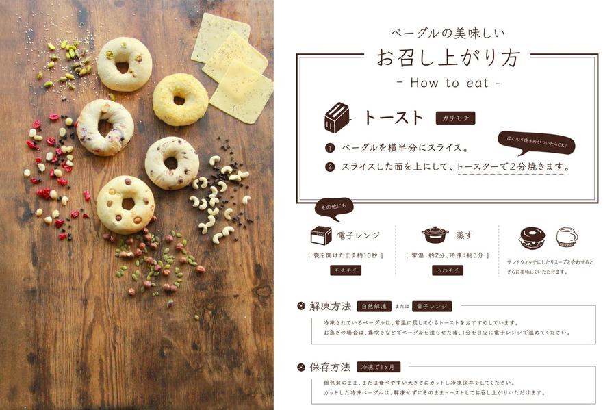 【自然解凍してから食べる場合】 ・ベーグルを切り吹きなどで軽く水で濡らし、電子レンジで15秒~30秒ほど温める ・ベーグル横半分にカットして、切り吹きなど濡らしてからトースターで2分温めてお召し上がりください。