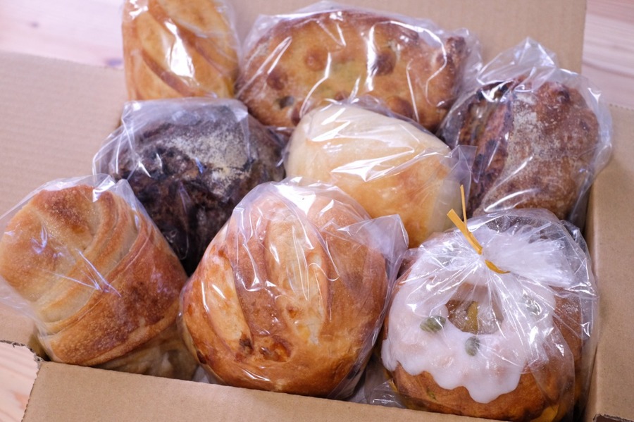 60サイズの箱にたっぷりと、3,600円相当のパンを入れます。 パンの大きさにより前後しますが、10個~15個ほど入ります。 ※同じ種類のパンが入る場合もございます。 ※商品のご指定やアレルギーへのご対応は出来かねますので、予めご了承ください。