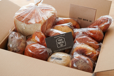80サイズ(外寸70cm)の箱に3,800円以上のパンを詰めてお送りします。 14〜16個前後のパンが入ります。