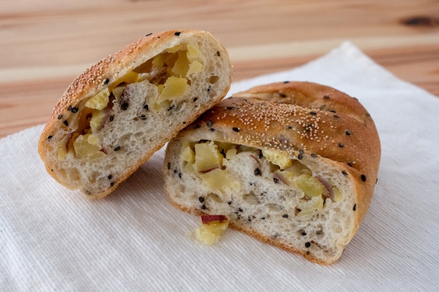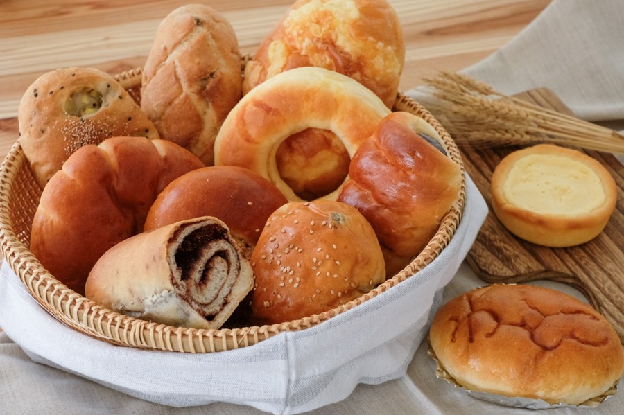 主な原材:小麦粉、三温糖、全粒粉、パン酵母、バター、ヨーグルト、プレミアムショートニング、伯方の塩、卵、牛乳、岩塩、パンプキンペースト、その他 ポテトサラダパン(商品一例):小麦粉、三温糖、全粒粉、卵、伯方の塩、酵母、バター、牛乳、ヨーグルト、プレミアムショートニング、じゃがいも、マヨネーズ / 調味料(アミノ酸等) ※アレルギーがご心配な方はご遠慮下さい。 ※各パンに原材料表示シールを貼付します。