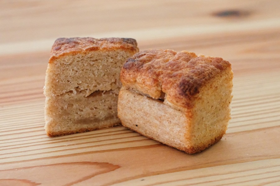 自然解凍後、あらかじめ余熱しておいたオーブンやトースターで温めてお召し上がりください。 パン全体に霧吹きなどで軽く水をかけてからトースターで3分~4分ほど加熱するとさっくり、もっちり出来たてのようになり美味しく召し上がれます。 厚みのあるパンは表面がこげやすいのでアルミホイルをかけて加熱してください。
