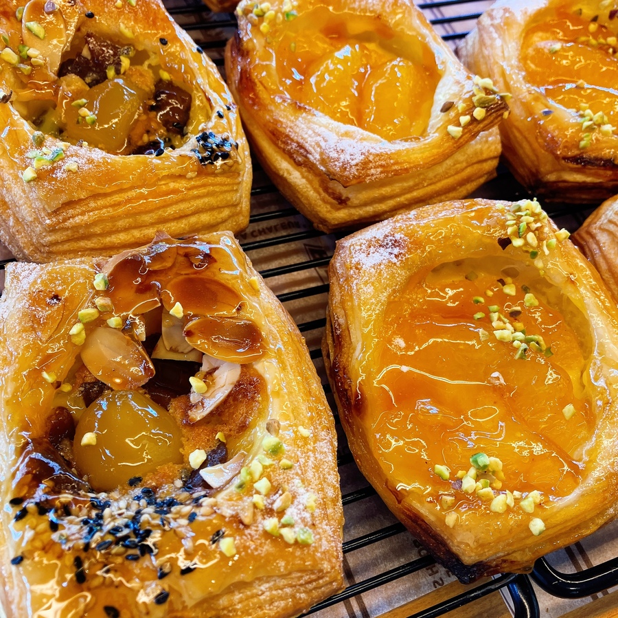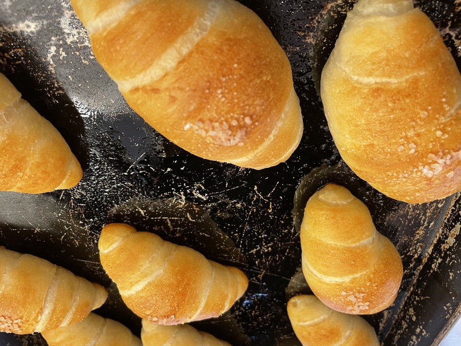 自然解凍後、あらかじめ余熱しておいたオーブンやトースターで温めてお召し上がりください。 パン全体に霧吹きなどで軽く水をかけてからトースターで3分~4分ほど加熱するとさっくり、もっちり出来たてのようになり美味しく召し上がれます。 厚みのあるパンは表面がこげやすいのでアルミホイルをかけて加熱してください。