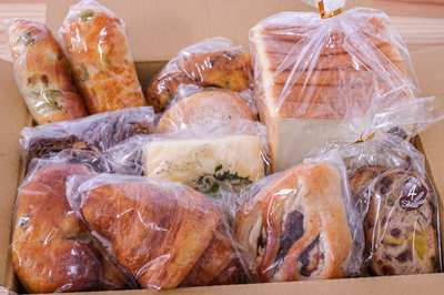 食パンまたは全粒粉食パンどちらか1斤が必ず入り、合計10個以上、2,700円相当のパンが入ります。 ※同じ種類のパンが2個入る場合もございます。