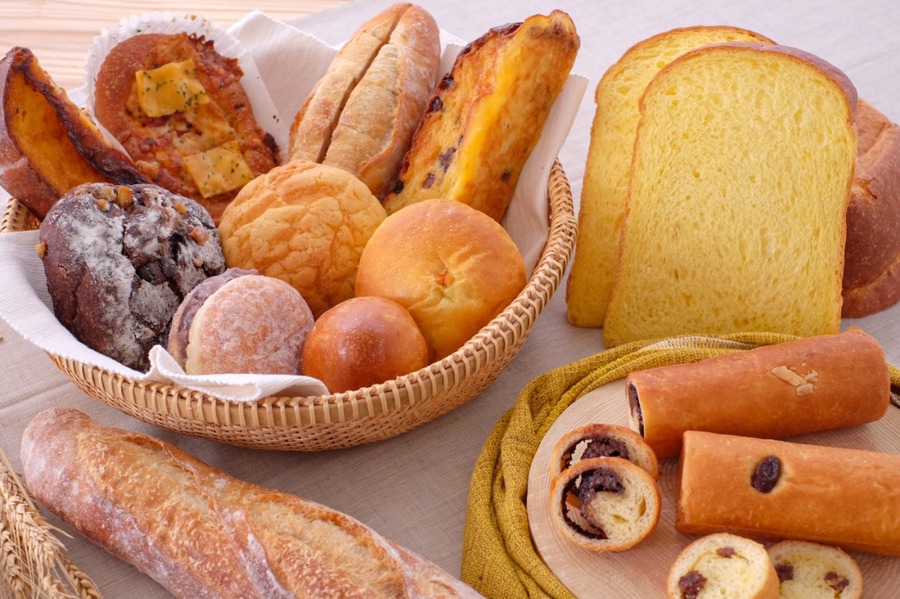 主な原材料:小麦粉、食塩、バター、マーガリン、牛乳、卵、パン酵母、レーズン、チョコレート など ※アレルギーがご心配な方はご遠慮下さい。 ※各パンに原材料表示シールを貼付します。 伊吹食パン(商品一例):小麦粉(国内製造)、卵、牛乳、砂糖、マーガリン、にんじん、食塩、パン酵母(一部に小麦、乳成分、卵を含む)
