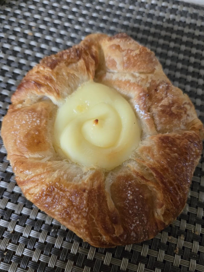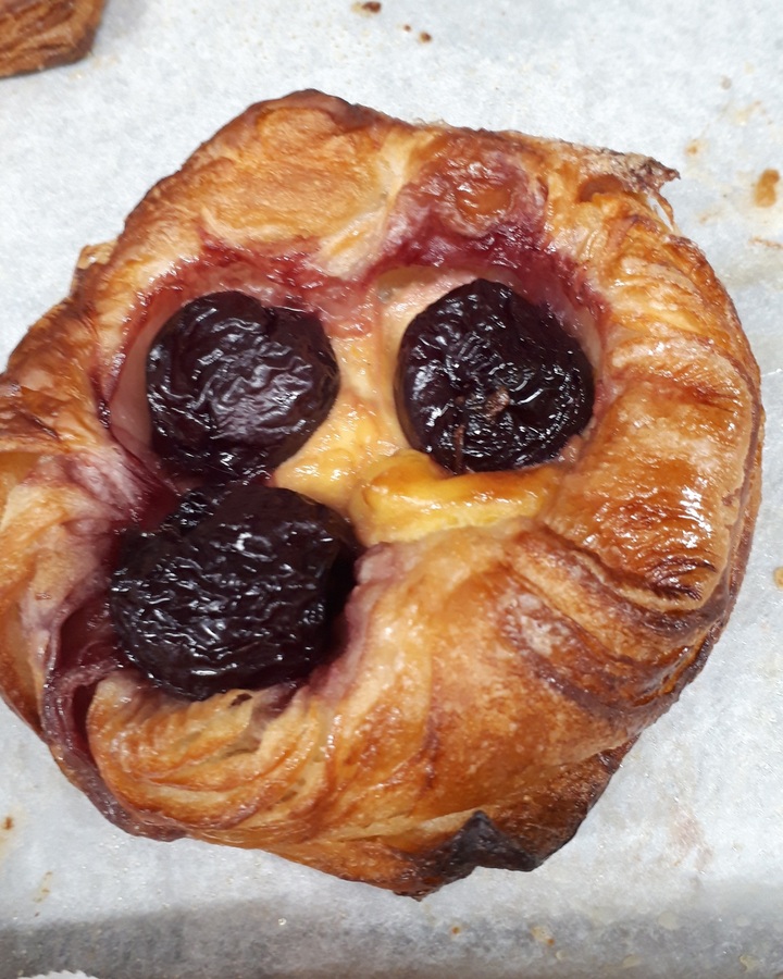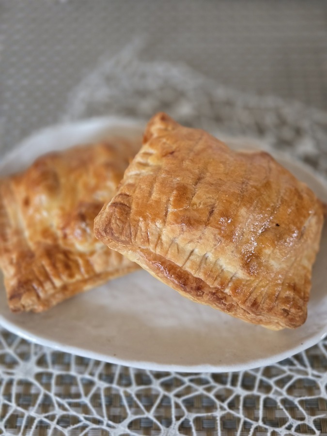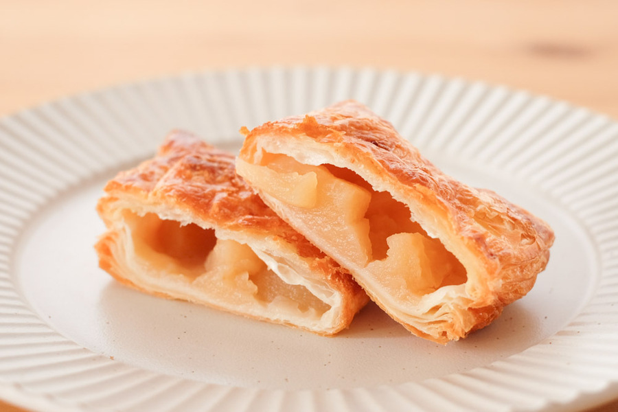 自然解凍後、デニッシュ、パイは自然解凍後アルミホイルをかけて、トースターで焦げない程度焼き、出来たらすぐに出さず、5分ほどそのままにしてから出すとカリッとして、焼きたてのように召し上がれます。
