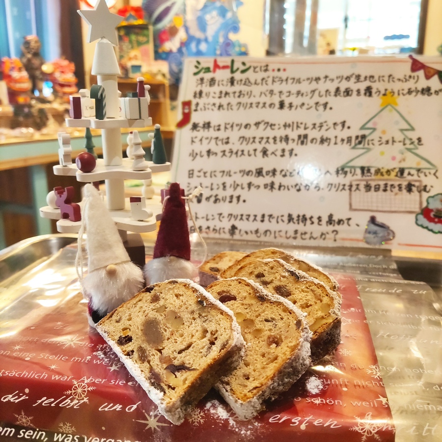 小麦粉、レーズン、クルミ、クランべりー、牛乳、バター、リンゴ、オレンジピール、パインアップル、レモンピール、砂糖(黒糖)、ラム酒、アーモンド、水あめ、植物油脂、酵母、塩、バニラビーンズ、スターアニス、山椒、シナモン、陳皮、クローブス、酵素、コーンスターチ/酸味料、香料、酸化防止剤、乳酸Ca、(一部に小麦、乳、アーモンド、リンゴ、オレンジを含む)