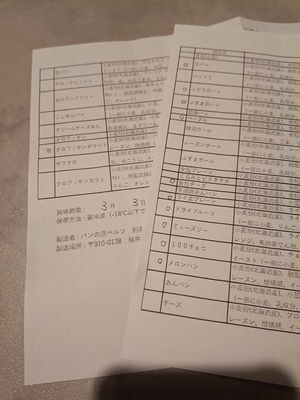 食パン、ぶどう食パン、ふすま食パン、ベーグル、全粒チーズ、ライ麦プレーン、ドライフルーツ、ミューズリー、100チョコ、メロンパン、クロワッサンダマンドが入っていました 品質表示リストも付けて下さり、とても丁寧なお店だと思います 食べるのが楽しみです!