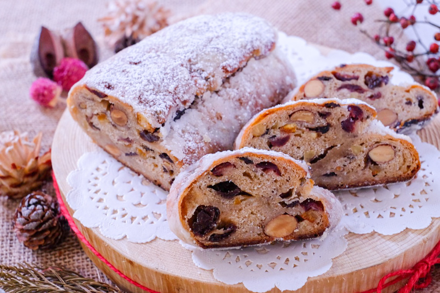 北海道産小麦、有機豆乳、菜種油、アーモンドプードル、甜菜糖、有機ココナッツオイル、ホシノ天然酵母、塩、オーガニックシナモン、オーガニックカルダモン、オーガニックナツメグ オーガニックレーズン、オーガニッククランベリー、ドライデーツ、ドライイチジク、オレンジピール、アーモンド、胡桃、粉糖 アレルゲン8品目(小麦) 特定材料に準ずるもの(アーモンド、胡桃、りんご、オレンジ) アレルギーが心配な方はご遠慮ください。