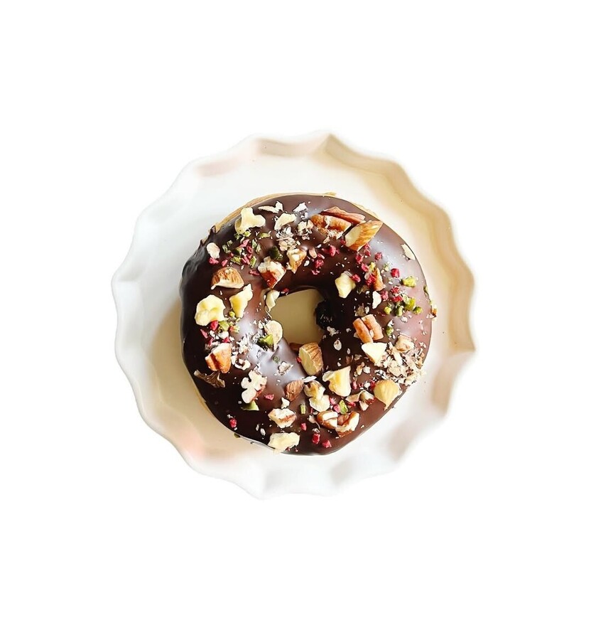 ふんわり生地にチョコレートをたっぷりコーティング。 香ばしいナッツをトッピングして、食感と風味のアクセントをプラスしました。 チョコの甘さとナッツの香ばしさが相性抜群の、満足感のある一品です。