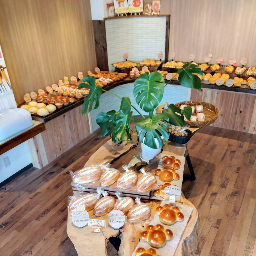 木のあたたかみを感じる明るい店内で、気軽に立ち寄っていただける空間を大切にしています。 店頭には、惣菜パンから甘いパン、シンプルな食事パンまで、常時およそ50種類ほどのパンが並びます。 その日の気分や食卓に合わせて、自由にお選びいただけます。
